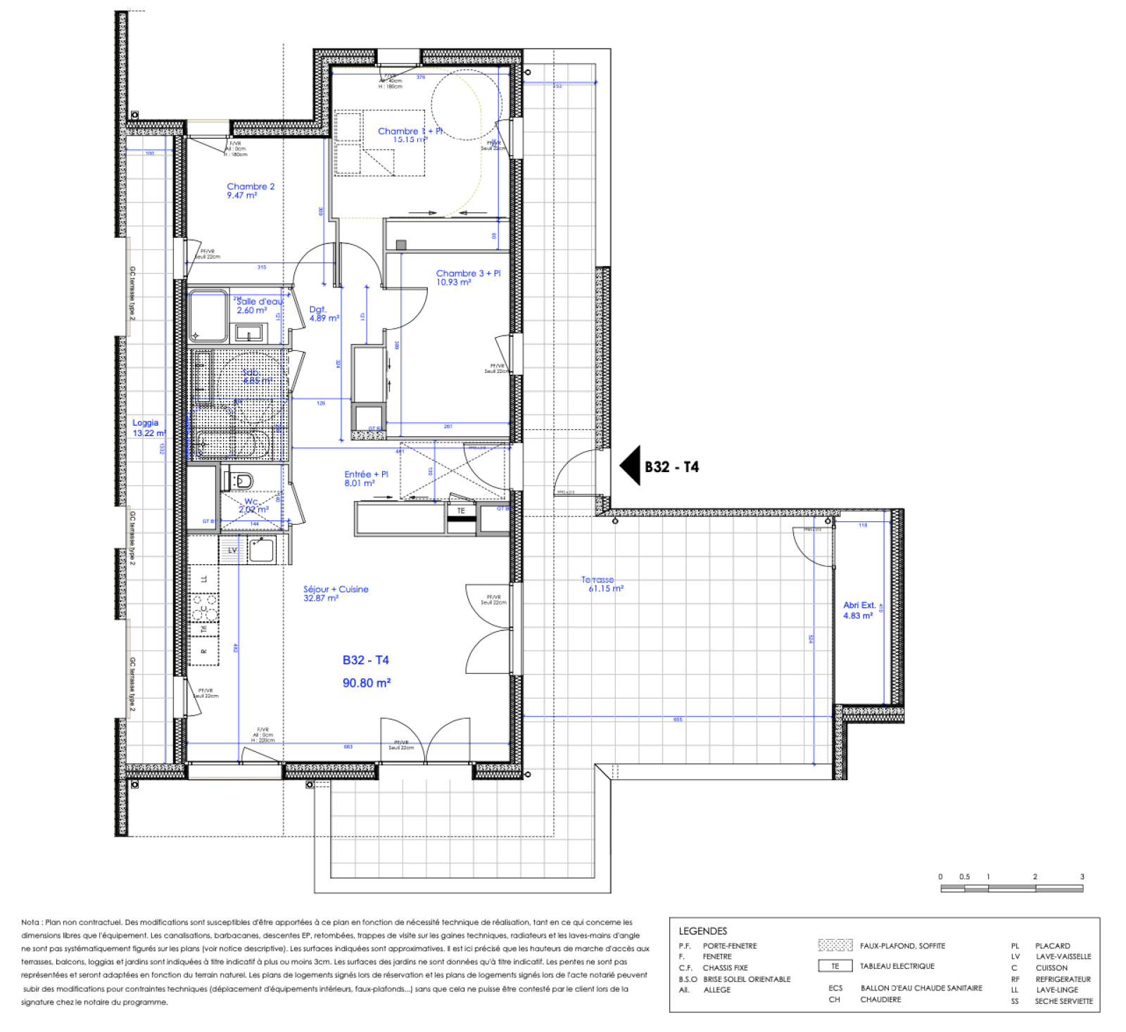 Sciez, proche des commodités, dans une résidence en cours de construction, appartement de type 4 au dernier étage (lot B32), comprenant : entrée, séjour / cuisine donnant sur une terrasse de 61m2 avec un abri extérieur et une loggia de 13,22m2, trois chambres dont deux donnant sur la terrasse et une sur la loggia, une salle de bains, une salle d'eau et des toilettes séparées. Deux places de stationnement et une cave sont comprises avec ce bien.