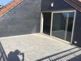 Hall avec dressing, cuisine équipée, grande pièce de vie avec terrasse (20 m2), salle de douche, toilettes et 2 chambres.