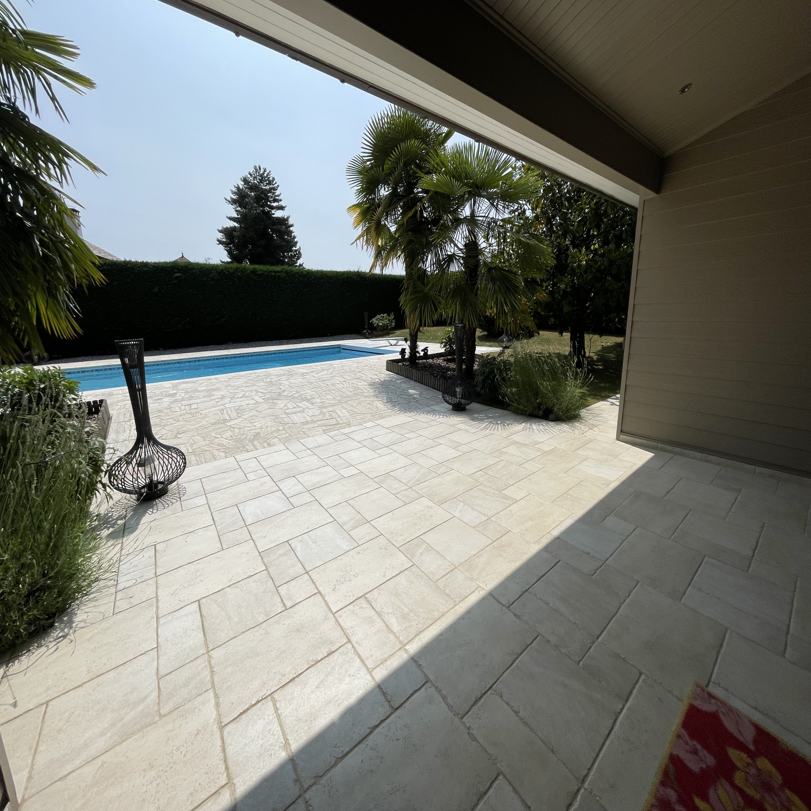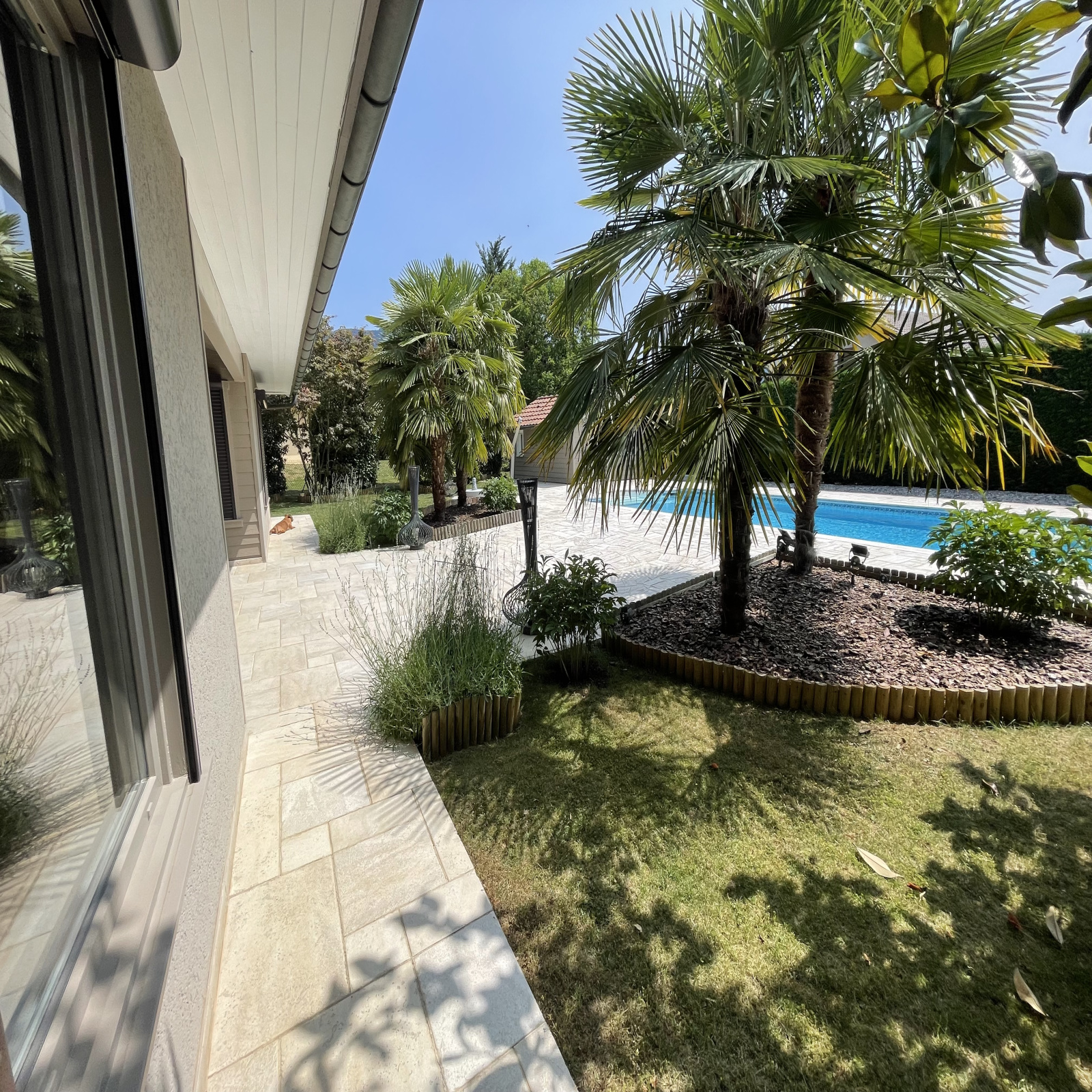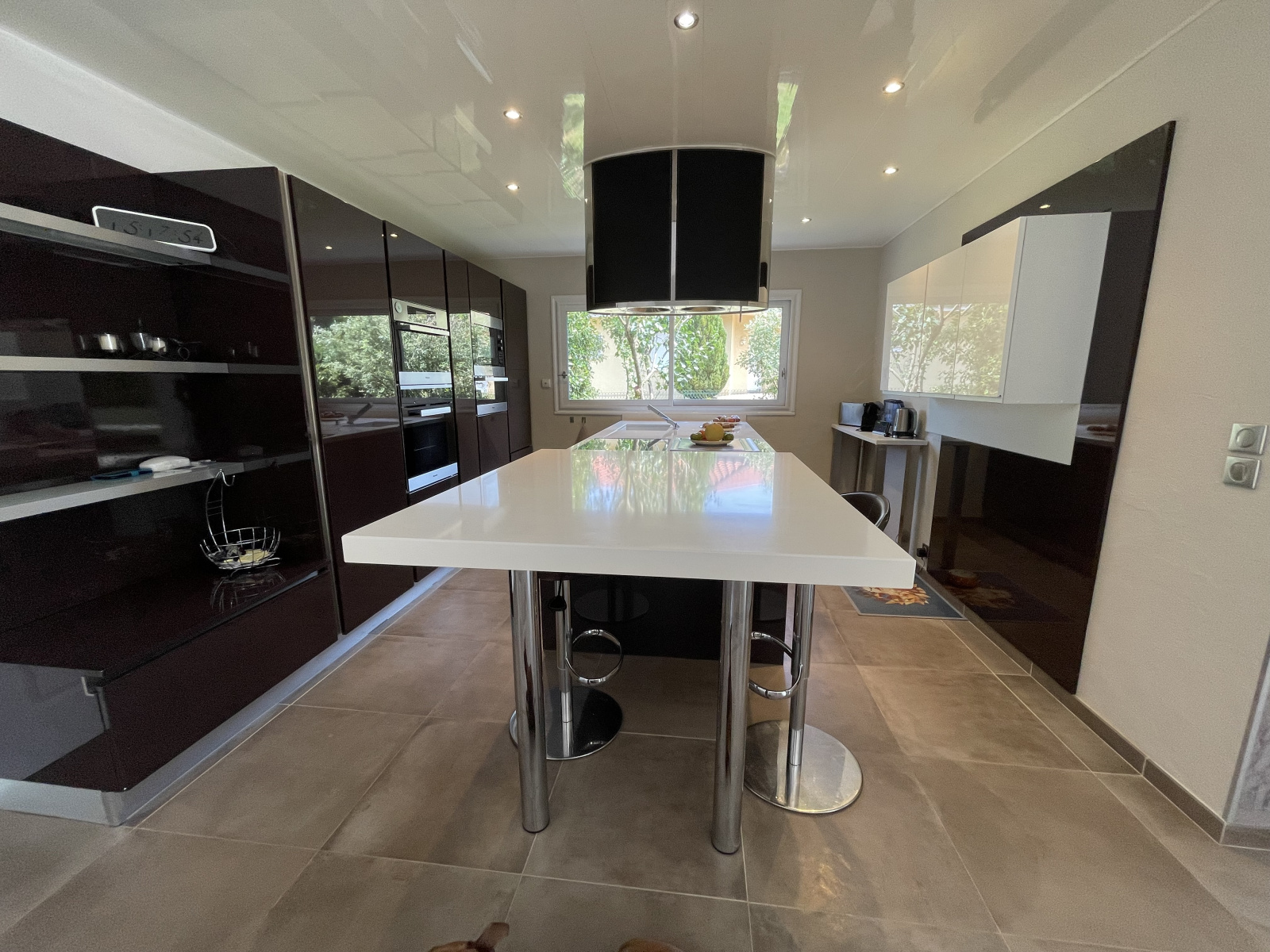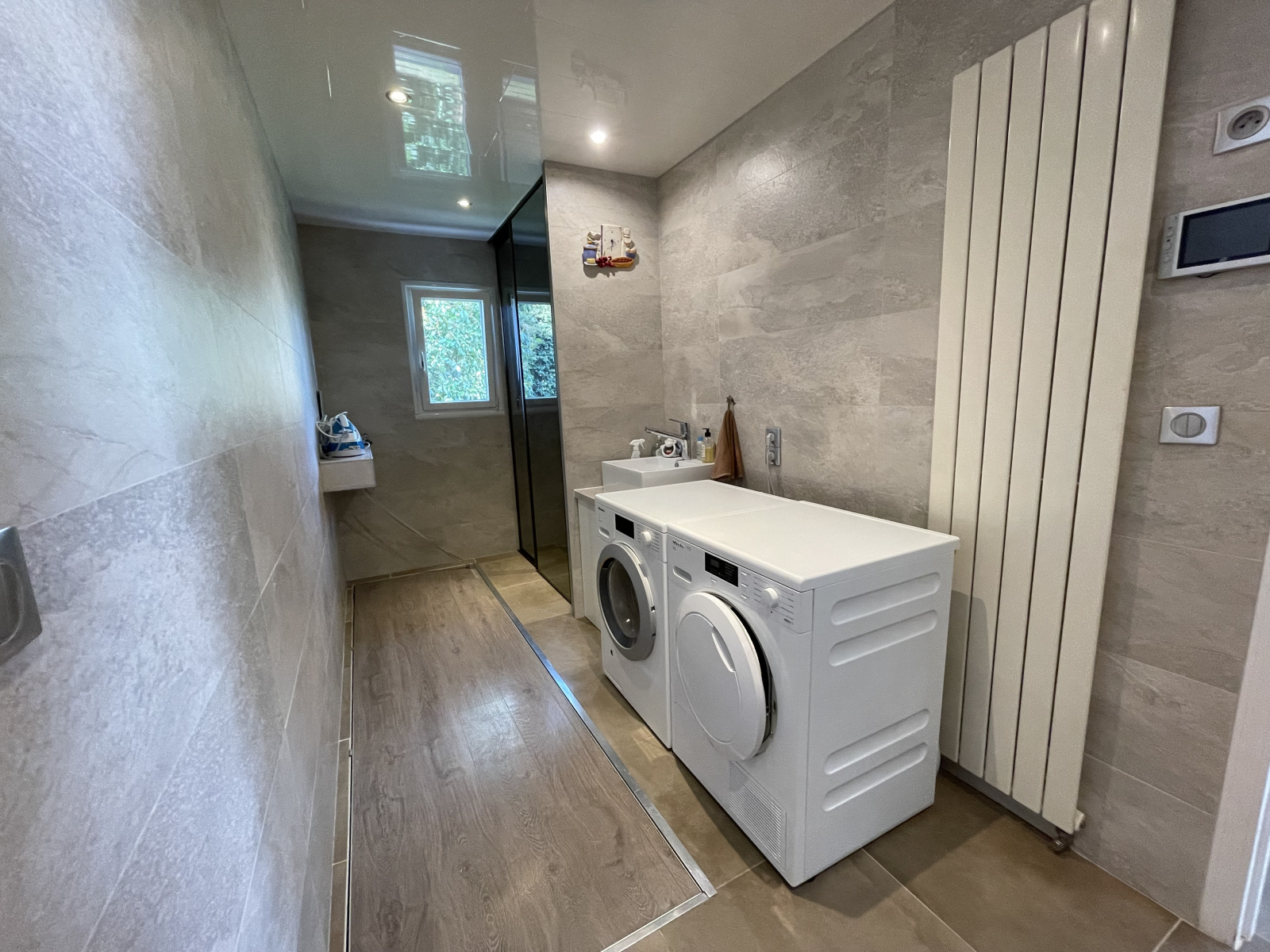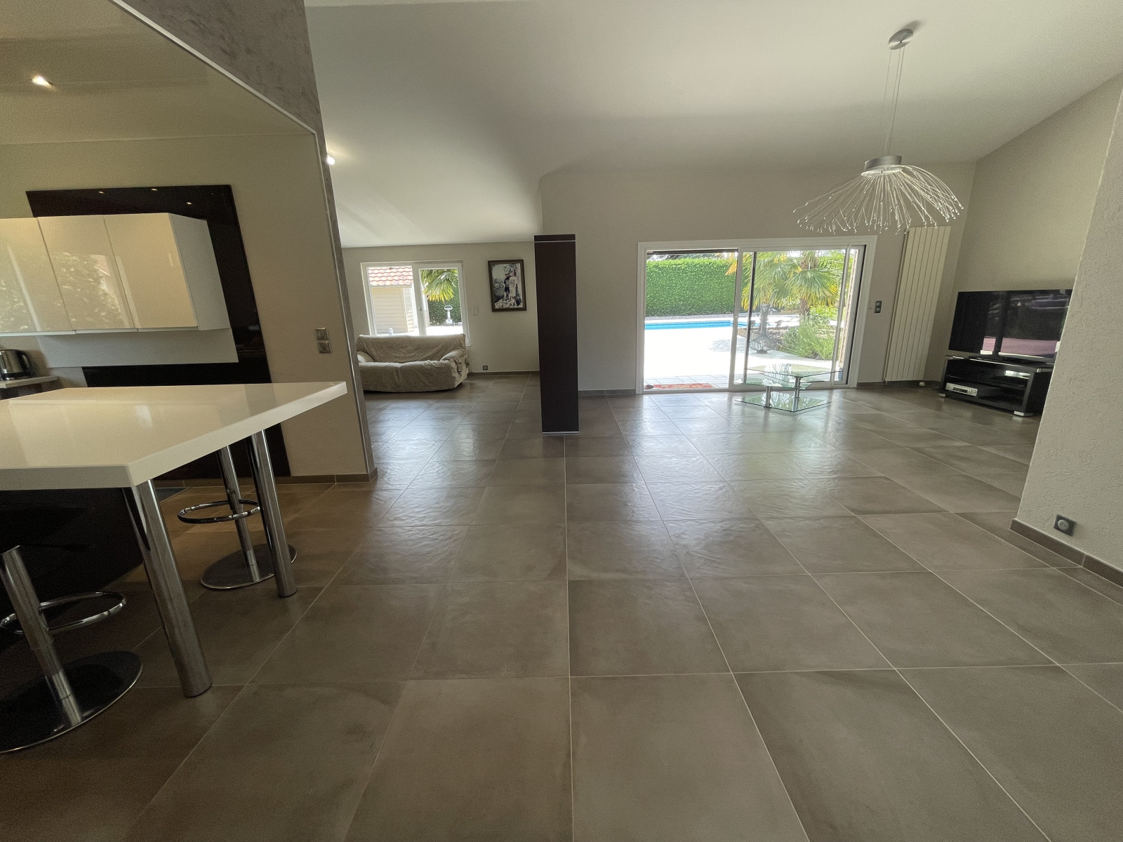 A votre arrivée, vous trouverez une spacieuse et lumineuse pièce de vie de 73 m², donnant sur la terrasse en partie couverte, une cuisine de standing entièrement aménagée (plaques, plaques japonaises, four traditionnel, four à vapeur, chauffe-plats,...), puis une buanderie. Dans l'autre aile de la villa : un espace nuit composé de trois chambres dont une suite parentale avec dressing et salle de bains et une salle d'eau.