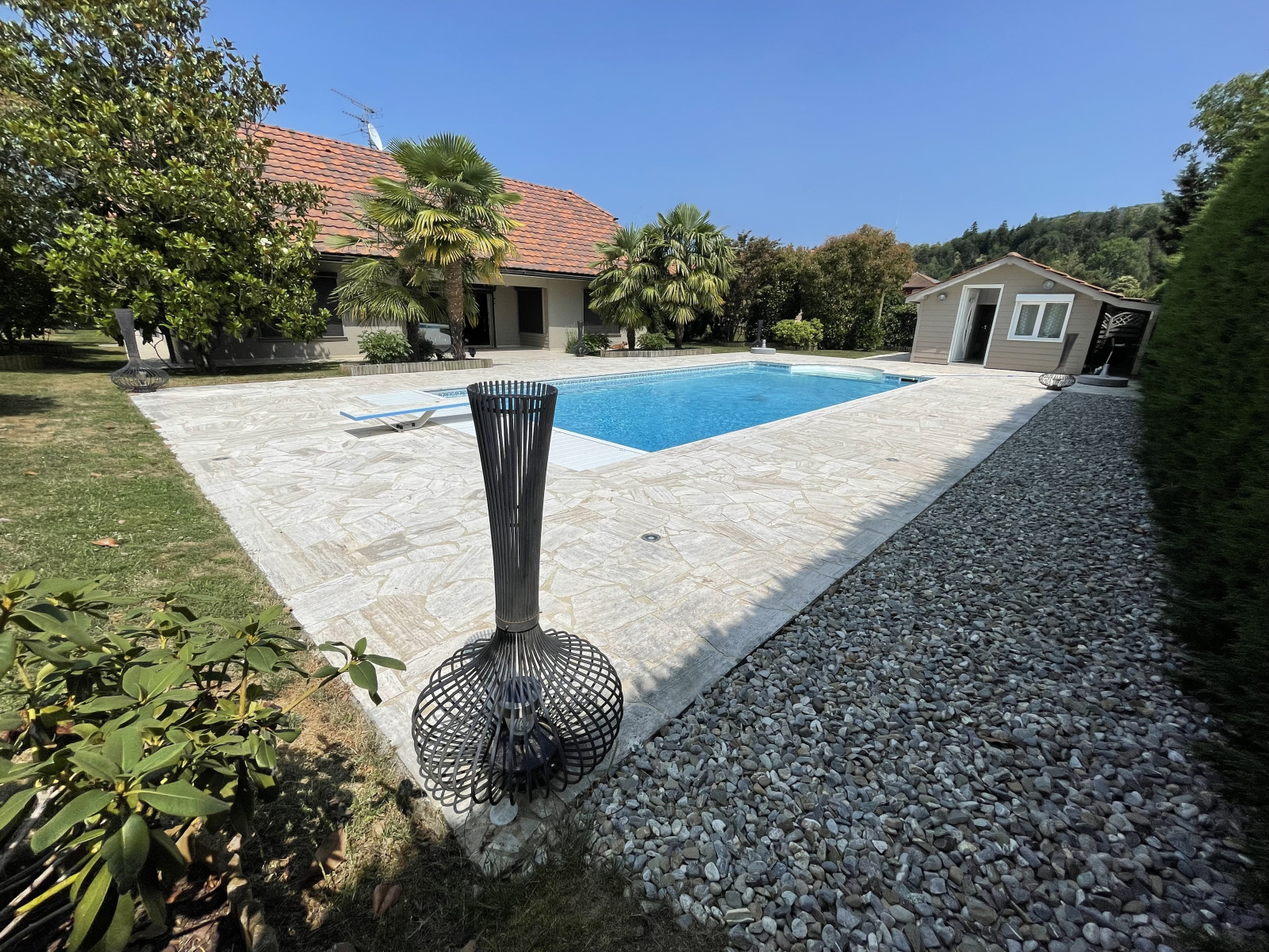 A l'exterieur, vous profiterez d'une piscine chauffée et d'un chalet de 20 m² aménagé d'une chambre, une salle d'eau et des wc.
