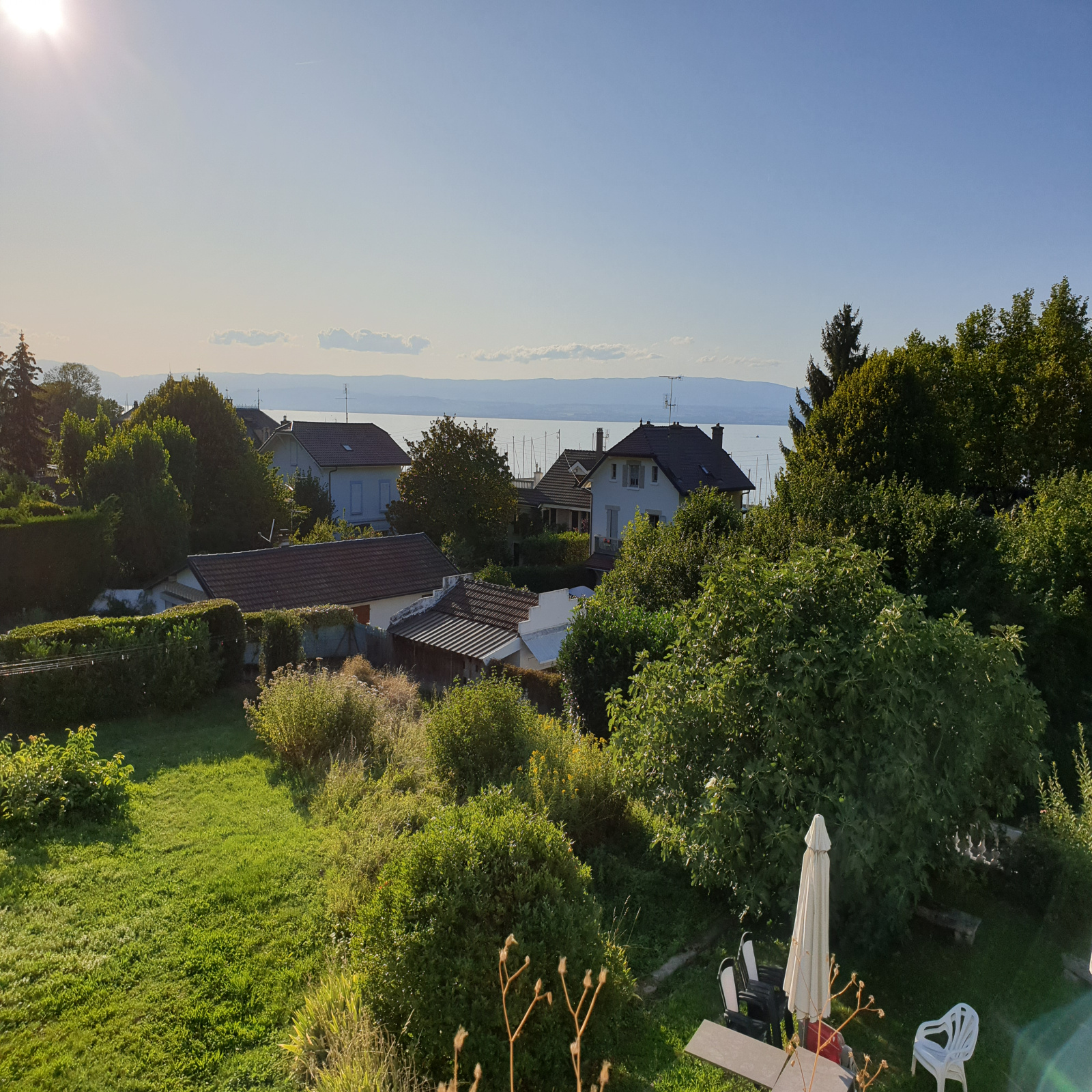 Appartement traversant 3 pièces de 80 m² dans une petite copropriété pleine de charme, dans un parc verdoyant, proche du centre-ville et du lac. Situé au 1er étage, spacieuse entrée, cuisine équipée avec petite terrasse exposée "Sud", un séjour et un salon avec une grande terrasse vue sur le Léman, deux spacieuses chambres, une au "Nord" vue lac et une au "Sud" avec placard et balcons. Deux caves en sous-sol. Stationnement sécurisé. Prise de charge pour véhicule électrique. Jardin commun. Aucun travaux à prévoir, menuiseries neuves en bois et alu, chaudière individuelle neuve, volets roulants motorisés, alarme. Façade, isolation et toiture de 2013. Pas de charge de copropriété, syndic bénévole. Copropriété de 3 lots principaux.