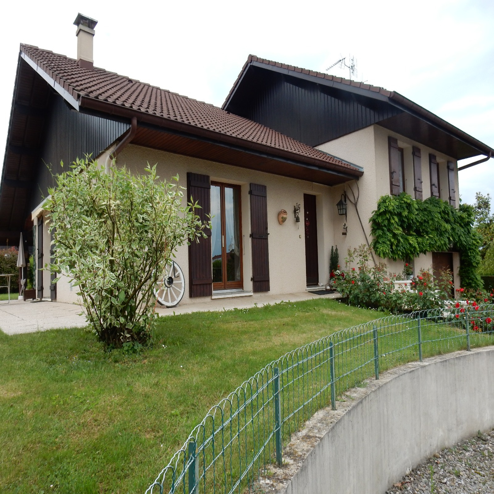 Maison de construction traditionnelle sur sous-sol total. Elle vous offre en rez de chaussée, une entrée, une cuisine équipée fermée, un salon et un séjour ouvrant sur une terrasse dallée dont 15 m2 couvert. Au 1/2 niveau supérieur, une salle de bains très spacieuse et lumineuse, deux grandes chambres avec placard/dressing. Au demi niveau inferieur, une chambre, une salle de douche + wc avec mains, une buanderie/laverie avec point d'eau et un garage carrelé porte motorisée. Demi niveau inferieur un Carnotzet de 23 m2, un atlier et une cave tempérée. Buchet et abri jardin. Le tout sur un terrain clos d'environ 800 m2 avec portail motorisé.