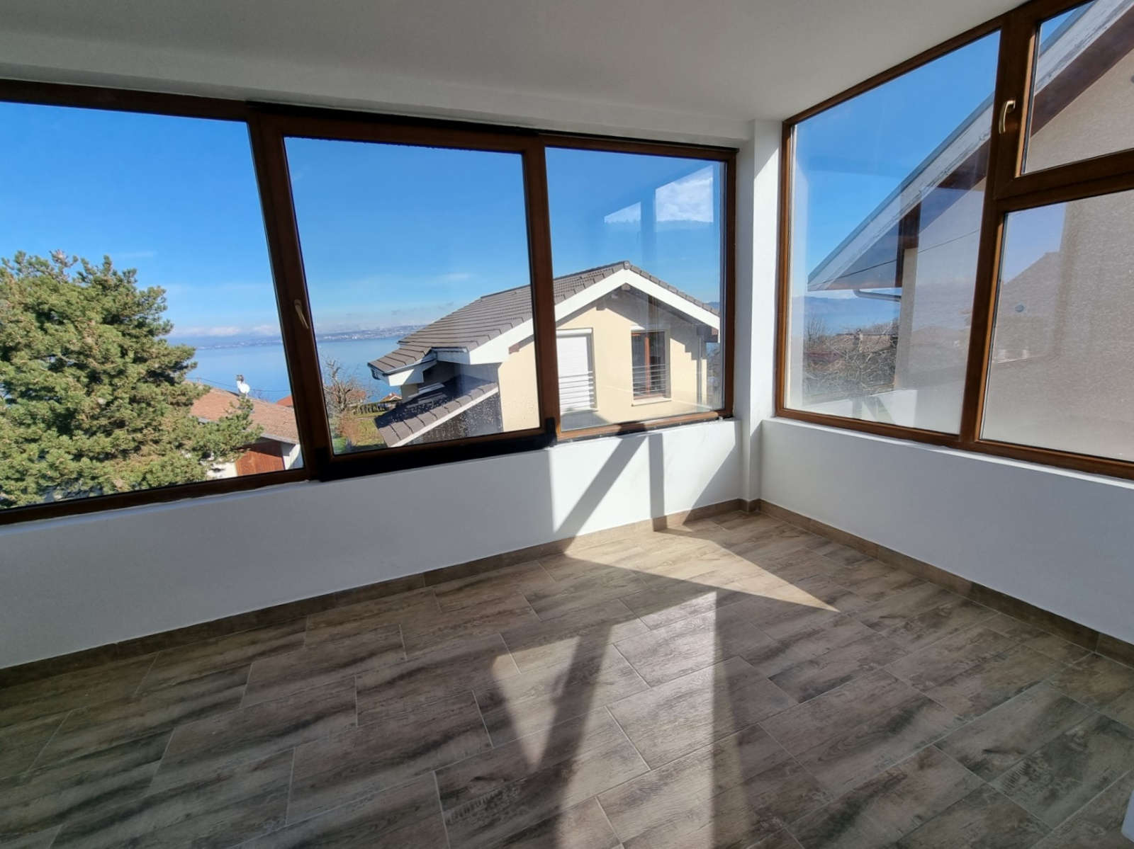 Splendide vue lac pour cet appartement de type 3 en duplex fraichement rénové. Il vous offre au 1er niveau, une entrée, un WC, un placard/buanderie, une cuisine équipée ouverte sur le séjour et la loggia où vous pourrez admirer le lac et les côtes Suisse. A l'étage, un palier dessert deux chambres de 11 et 13 m² dont une dispose d'une terrasse de 10m² avec une pleine vue lac et une salle de douche à l'Italienne WC. Ce bien dispose de deux places de stationnement dont une couverte. Proche de toutes commodités, cet appartement saura vous séduire par ses volumes et sa luminosité.