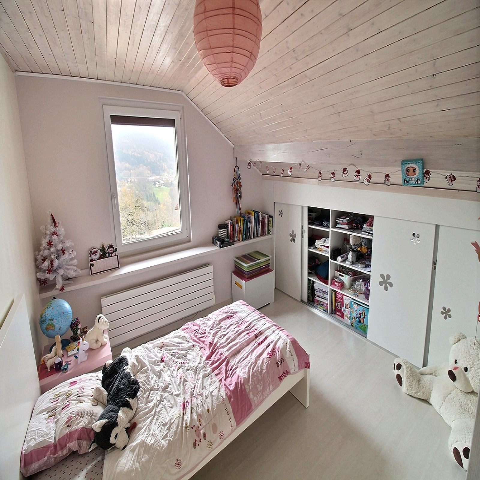 Il est composé d'une entrée, un salon séjour avec poele à granules, une cuisine ouverte et équipée, cellier, une chambre, une salle d'eau, puis à l'étage deux chambres dont une avec salle de bains ainsi que de nombreux rangements.